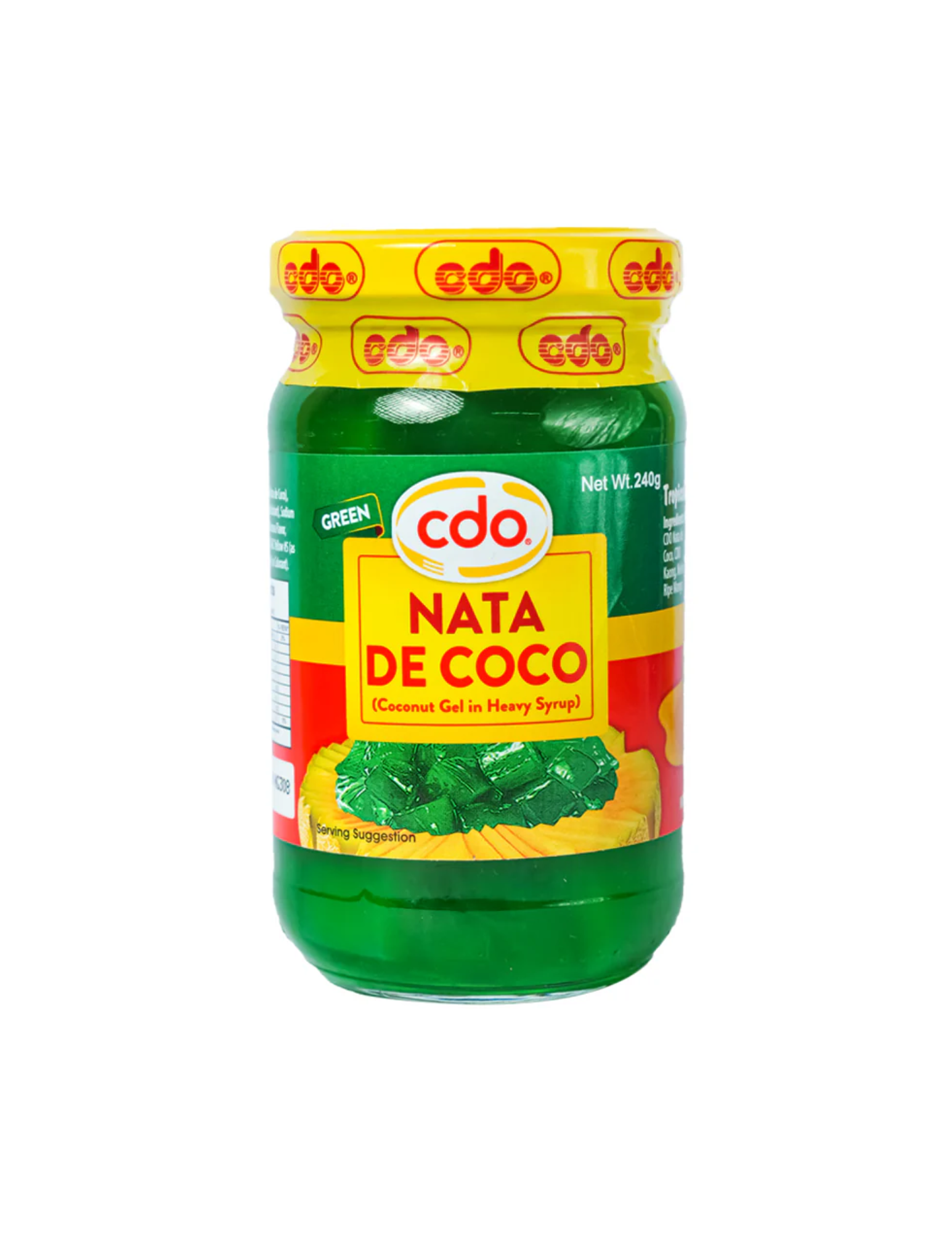CDO Nata De Coco Green. This chewy, jelly-like treat is produced through the fermentation of coconut water, resulting in translucent, green cubes soaked in sweet syrup. Perfect for enhancing fruit salads, halo-halo, or enjoying straight from the jar, it's a delightful addition to any dessert repertoire