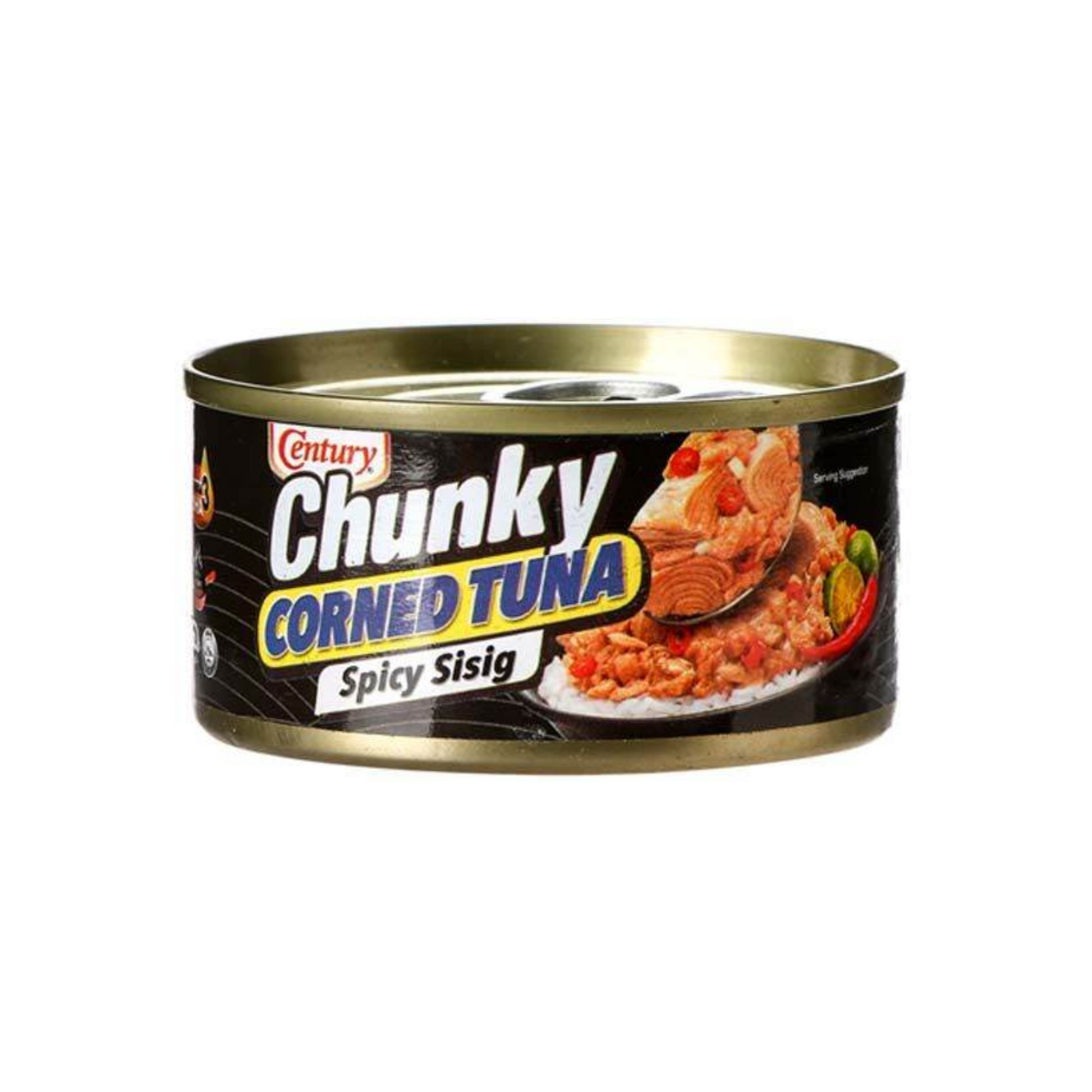Century Tuna Chunky Corned Tuna Spicy Sisig! This 85g can packs the rich taste of corned tuna with the sizzling flavors of Filipino-style sisig perfectly seasoned with spices and chili for that authentic kick.