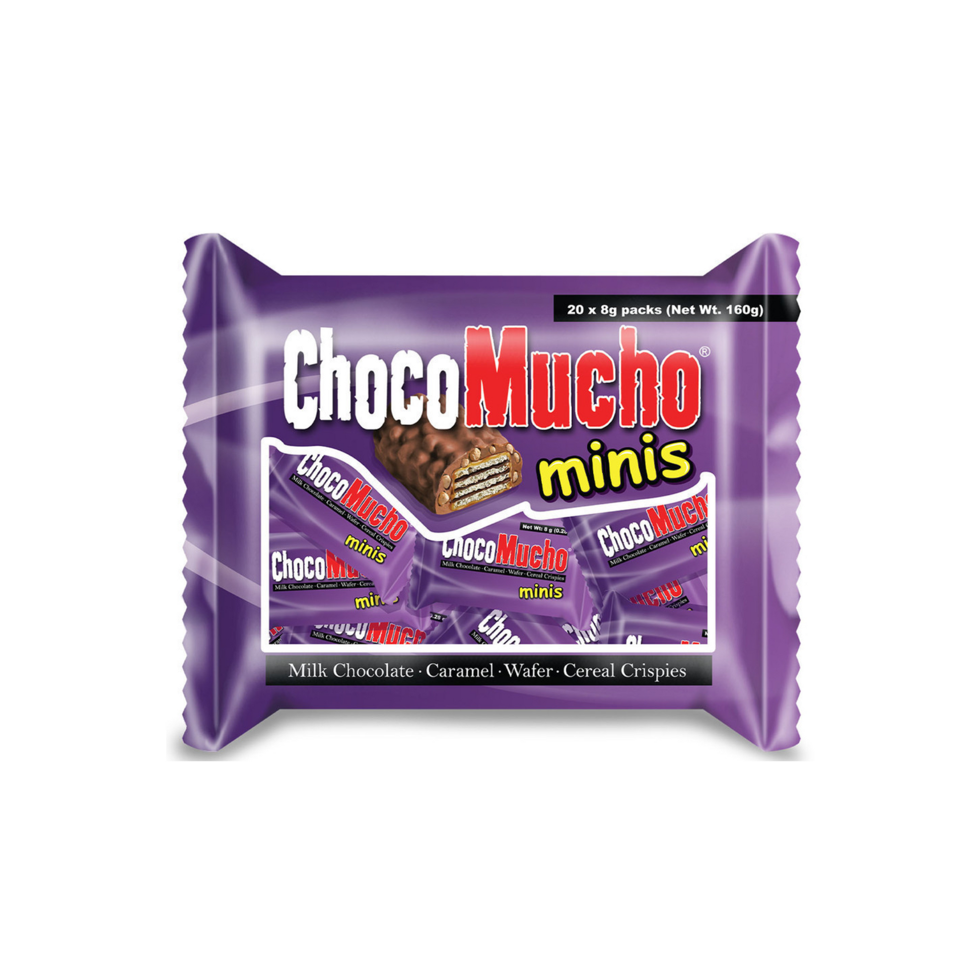 Choco Mucho Milk Chocolate Minis. Each mini bar delivers layers of crispy wafer, chewy caramel, and crunchy rice crispies coated in smooth, creamy milk chocolate. Perfect for lunchboxes, giveaways, or a quick sweet fix any time of the day.