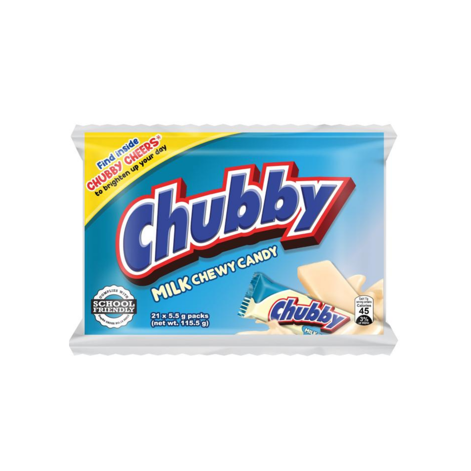Chubby Chewy Candy Milk. Each individually wrapped piece offers a rich milk flavor with a smooth, chewy texture thatβs perfect for satisfying sweet cravings anytime. The pack contains 20 candies, ideal for sharing, snacking, or adding to party favors.