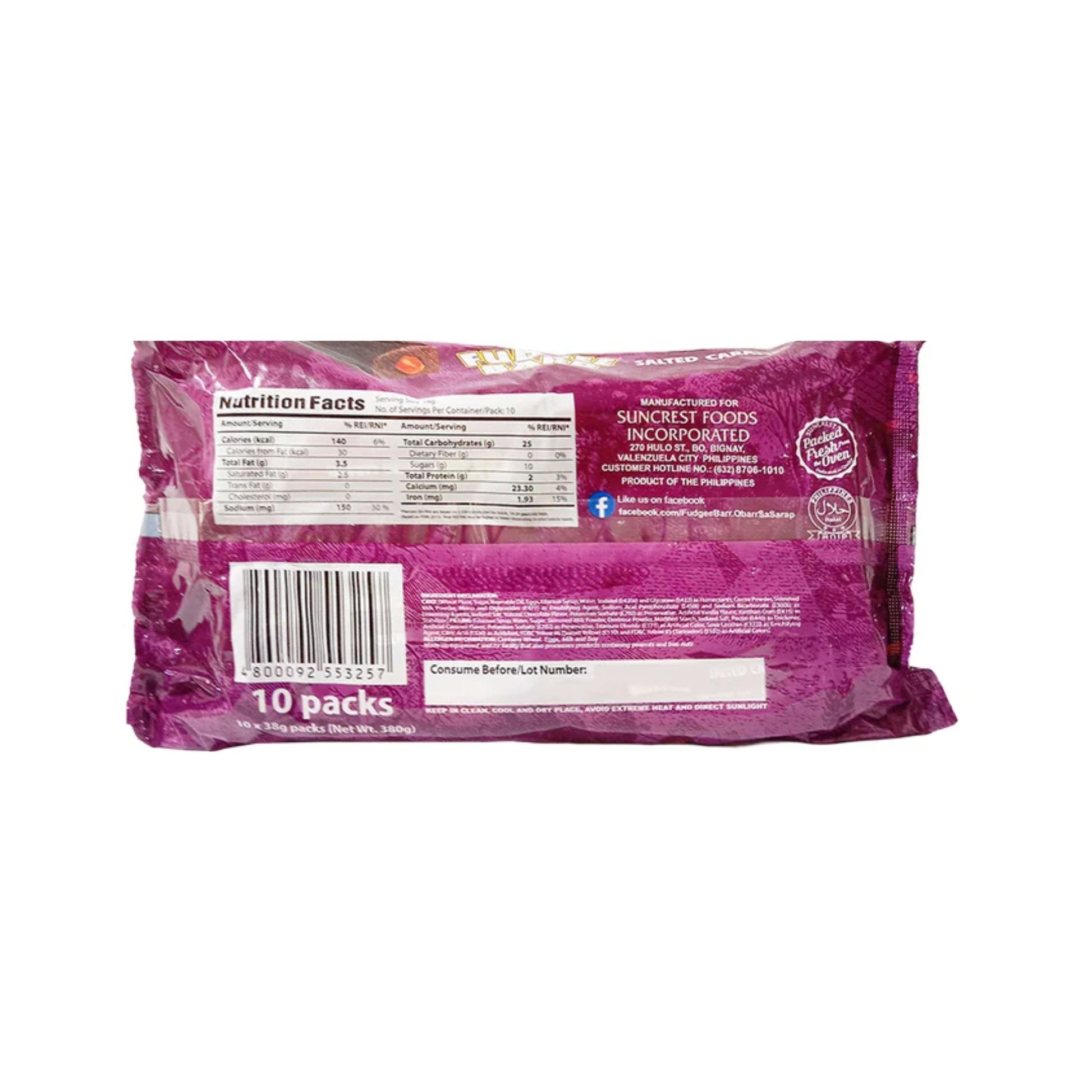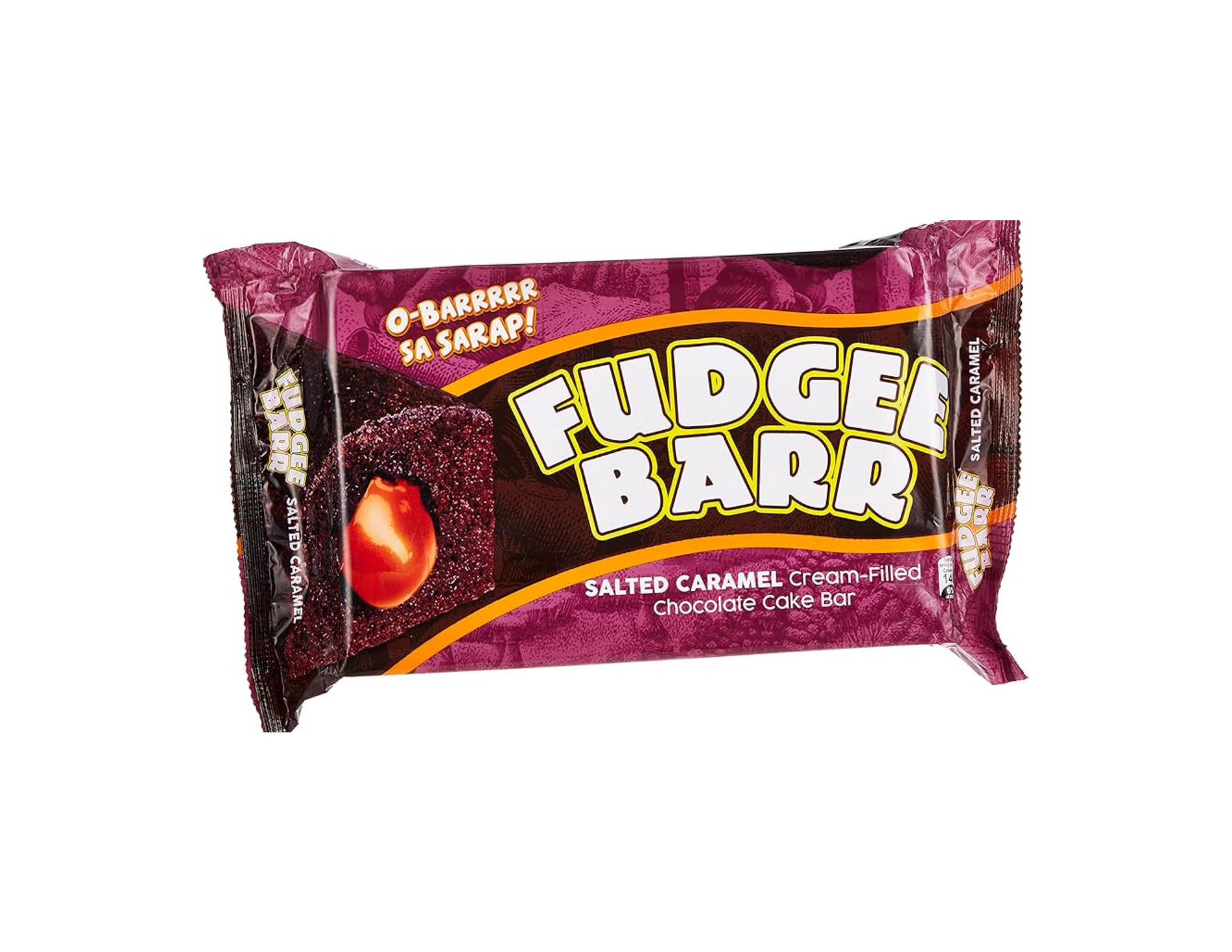 Fudgee Barr Salted Caramel. This soft, moist cake bar is generously filled with a rich, creamy salted caramel center for a deliciously satisfying bite. Each pack includes 10 individually wrapped bars—great for baon, snacks, or dessert on the go.