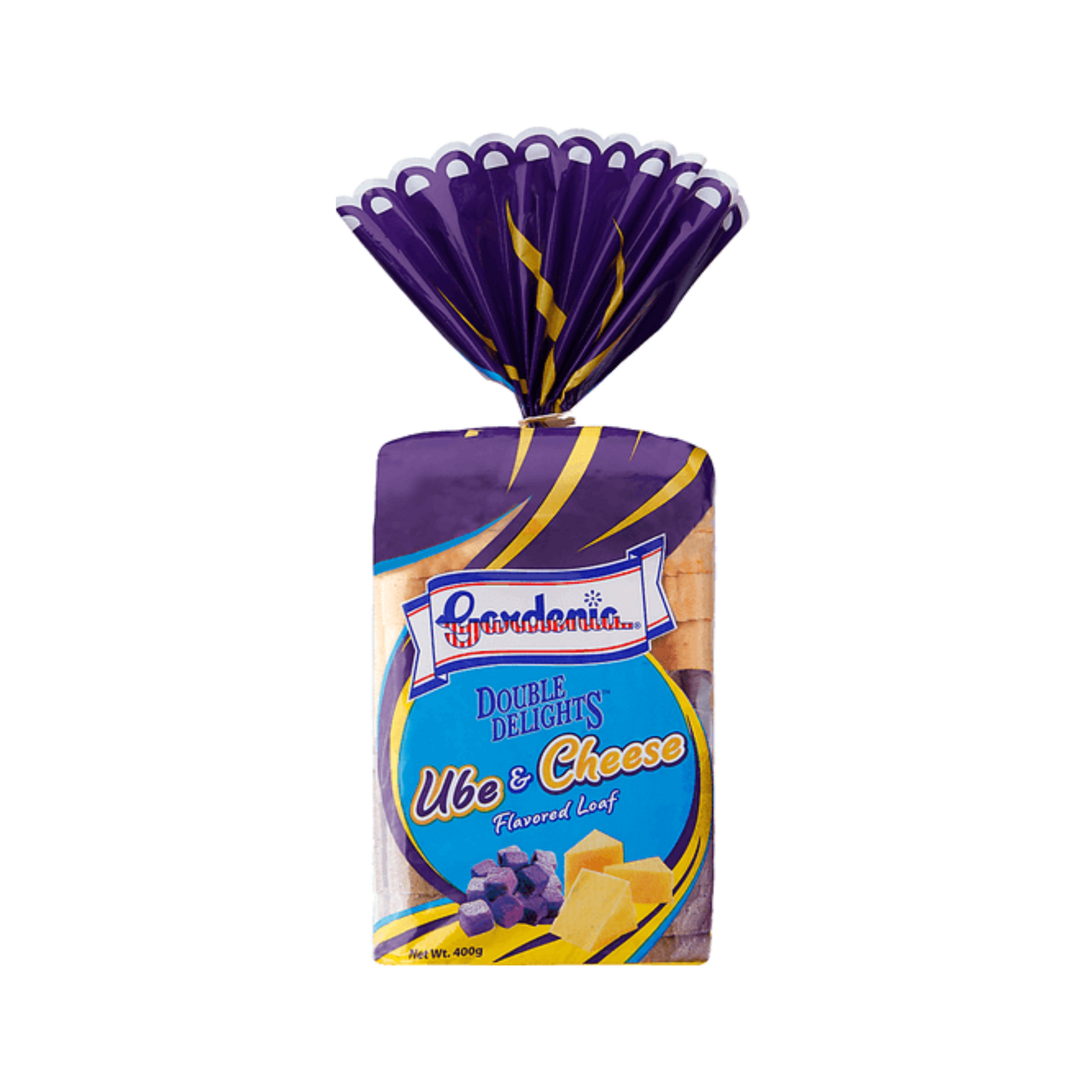 Gardenia Double Delights Ube & Cheese Loaf. This flavorful loaf combines the creamy sweetness of ube (purple yam) with the rich, savory taste of cheese, swirled into soft, fluffy bread. Itβs a deliciously unique pairing that makes every slice a fun and satisfying treat.