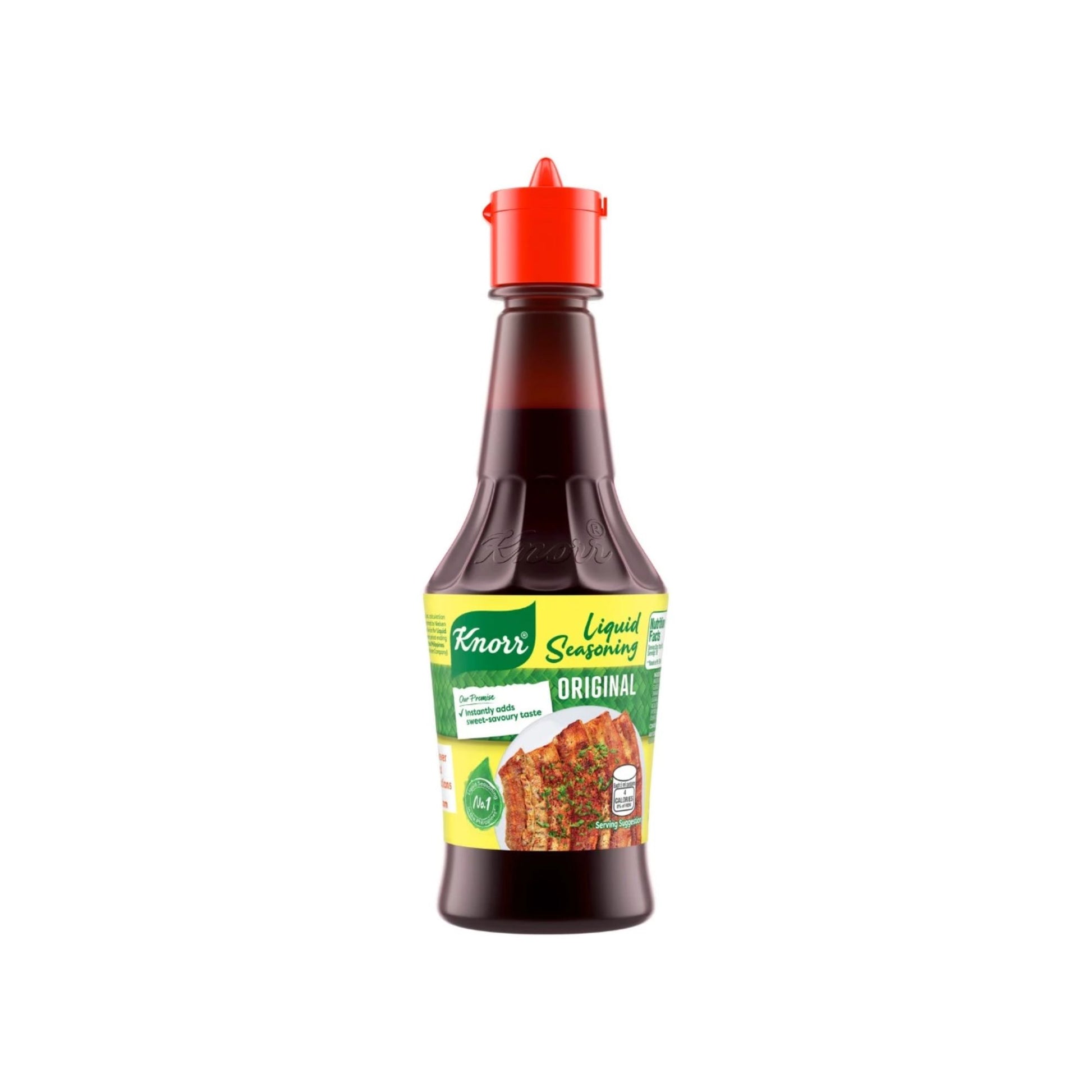 KNORR Liquid Seasoning This rich and flavorful seasoning is perfect for adding a savory depth to all your favorite meals. Whether you're cooking meats, vegetables, soups, or sauces, KNORR Liquid Seasoning brings out the best in every dish with its unique blend of umami-rich ingredients. It’s your go-to seasoning for a burst of taste in a snap!