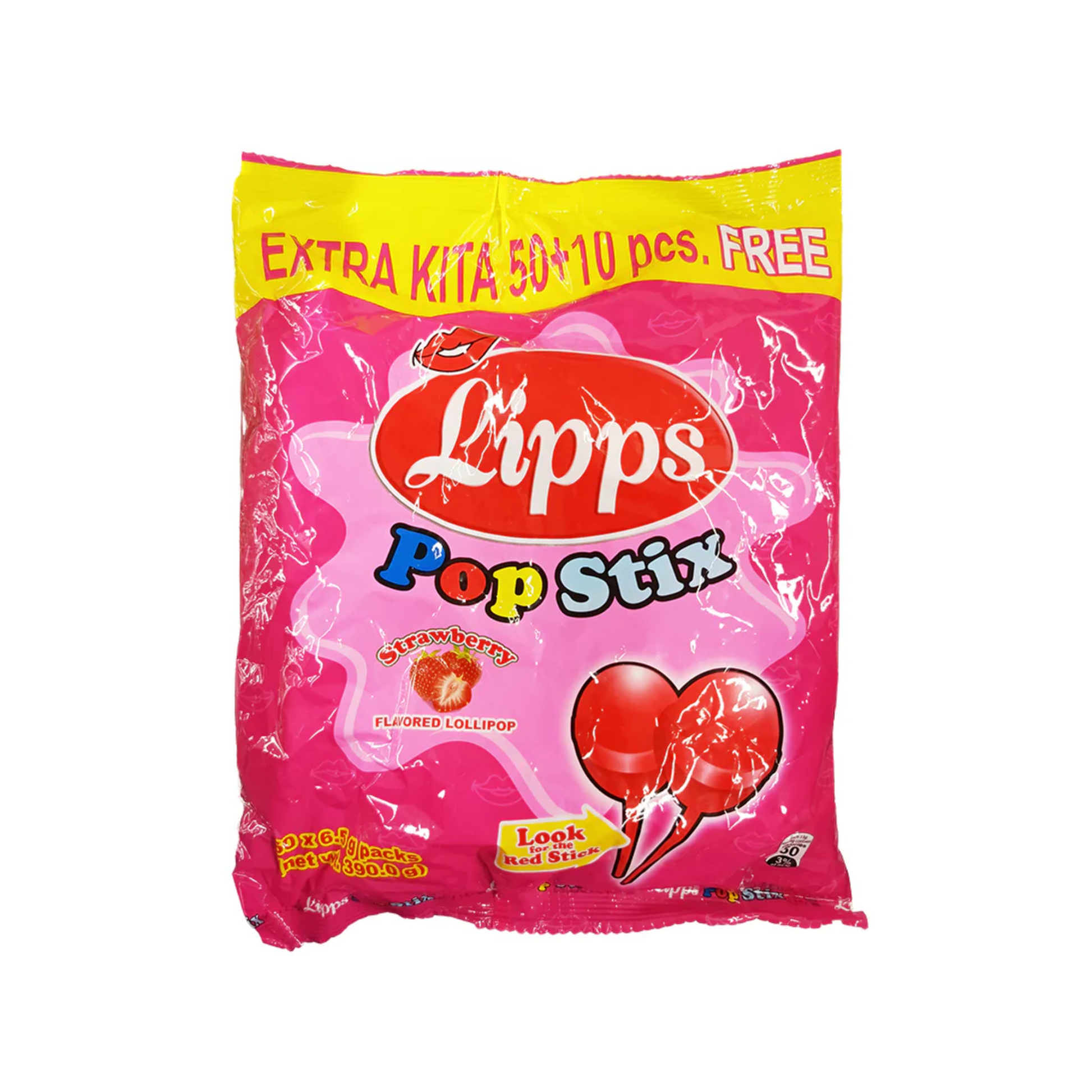 Lipps Pop Stix Strawberry Flavored Lollipops! This value pack includes 50 lollipops plus 17 FREE, all bursting with the juicy and fruity taste of strawberry. Each lollipop is individually wrapped—perfect for baon, party treats, giveaways, or everyday enjoyment. A classic Filipino favorite for kids and candy lovers of all ages!