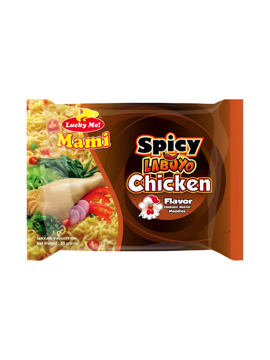 Lucky Me! Instant Mami Spicy Labuyo Chicken is a fiery and flavorful noodle soup with a rich chicken broth infused with the intense heat of labuyo chili for an extra spicy kick.
