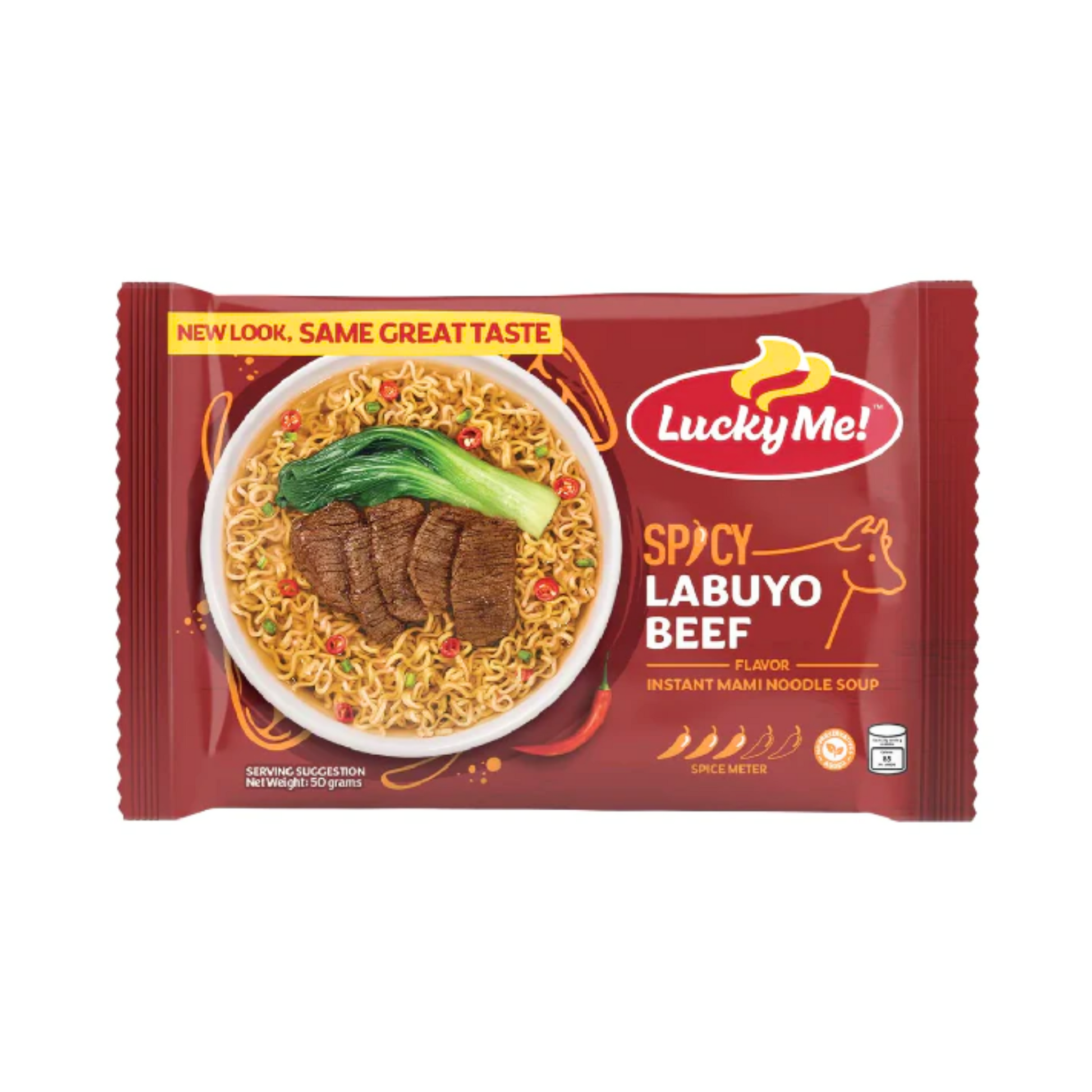 Lucky Me! Spicy Labuyo Beef, a bold twist on classic beef mami. This instant noodle soup combines rich beef broth with the fiery kick of labuyo chili, one of the hottest native peppers in the Philippines. Perfect for those who crave strong flavors and fast meals.