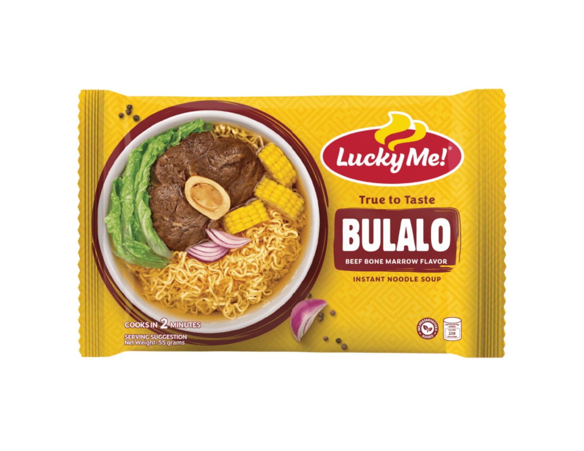 Lucky Me! Instant Noodle Soup Bulalo Experience the rich and savory taste of traditional Filipino bulalo in a convenient instant noodle format. This 55g pouch captures the essence of slow-simmered beef shank and bone marrow broth, delivering a comforting meal that's ready in minutes.