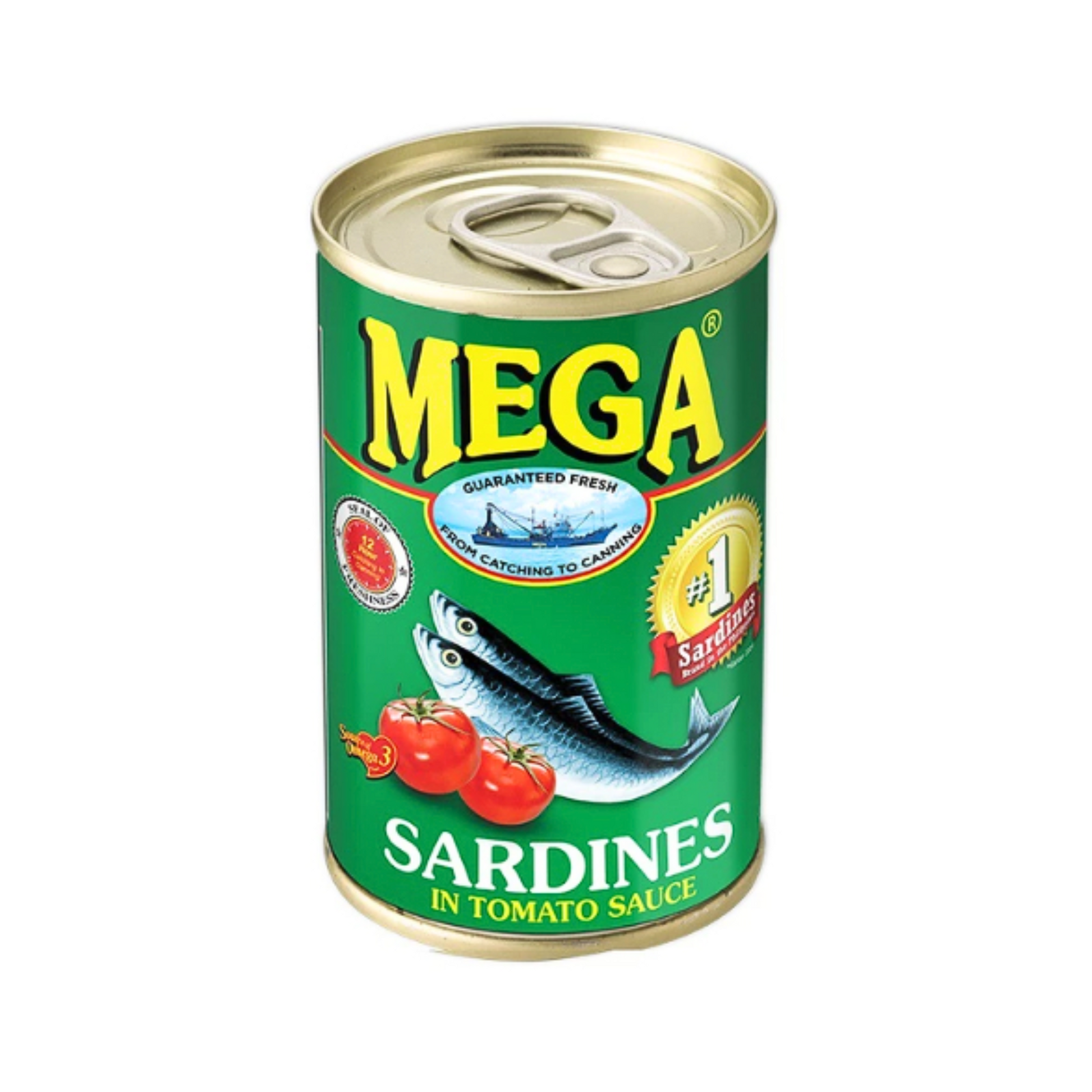 Mega Sardines in Tomato Sauce, packed fresh and sealed within 12 hours from catch to can. This green-labeled 155g easy-open can is filled with high-quality sardines soaked in a thick, flavorful tomato sauce.