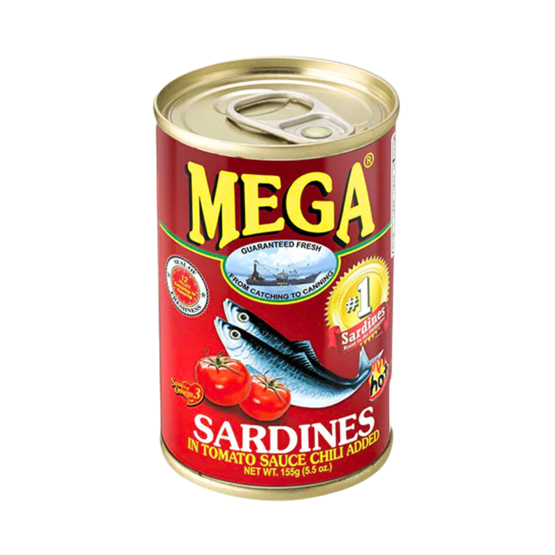 Mega Sardines in Tomato Sauce with Chili! Packed fresh within 12 hours from catch to can, these sardines are soaked in rich tomato sauce with just the right level of chili heat. Housed in a 155g easy-open red can, this is a convenient, flavorful option for quick meals, emergency food storage, or everyday ulam with rice.