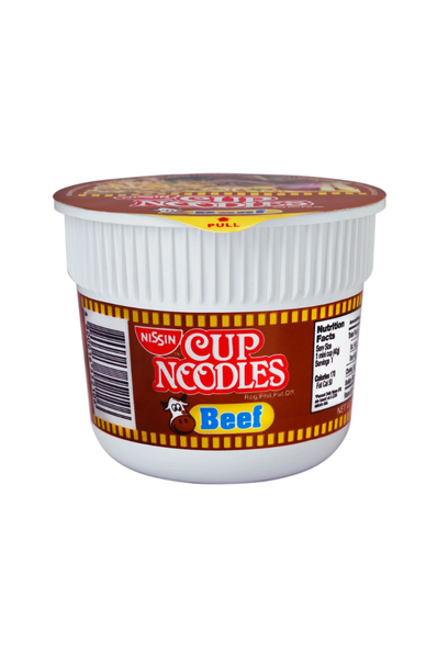 Nissin Cup Noodles Beef Mini. This instant noodle cup features a hearty beef flavor, complemented by meaty bits and vegetables, offering a comforting meal in just 3 minutes. Ideal for quick lunches, snacks, or on-the-go dining, it's your perfect companion anytime, anywhere.