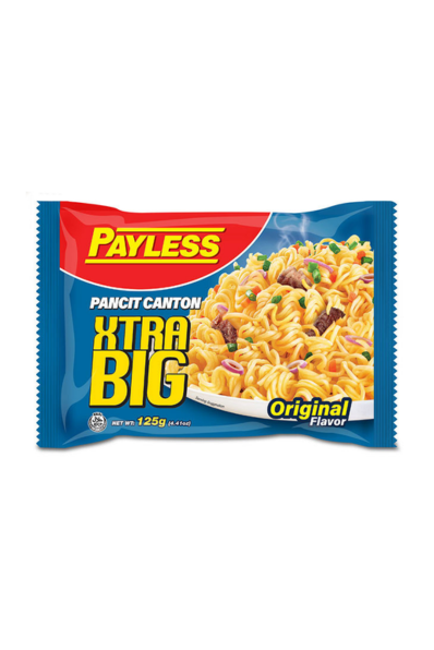 Payless Xtra Big Pancit Canton Original. This extra big 125g serving delivers the familiar savory-garlic flavor you love in a more satisfying portion perfect for quick meals, late-night cravings, or a hearty snack.