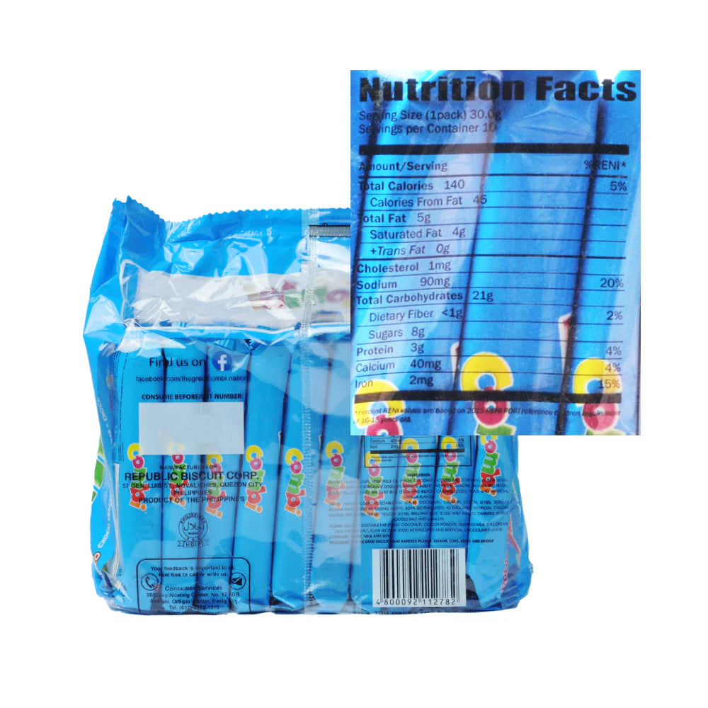 Biscuit: Wheat Flour, Vegetable Oil (Palm, Coconut), Iodized Salt, Caramel Color (E150), Malt, Sodium Bicarbonate (E500) as Raising Agent, Artificial Colors [Allura Red (E129), Sunset Yellow (E110), Brilliant Blue (E133), Indigo Carmine (E132)], Yeast, Artificial Vanilla Flavor.