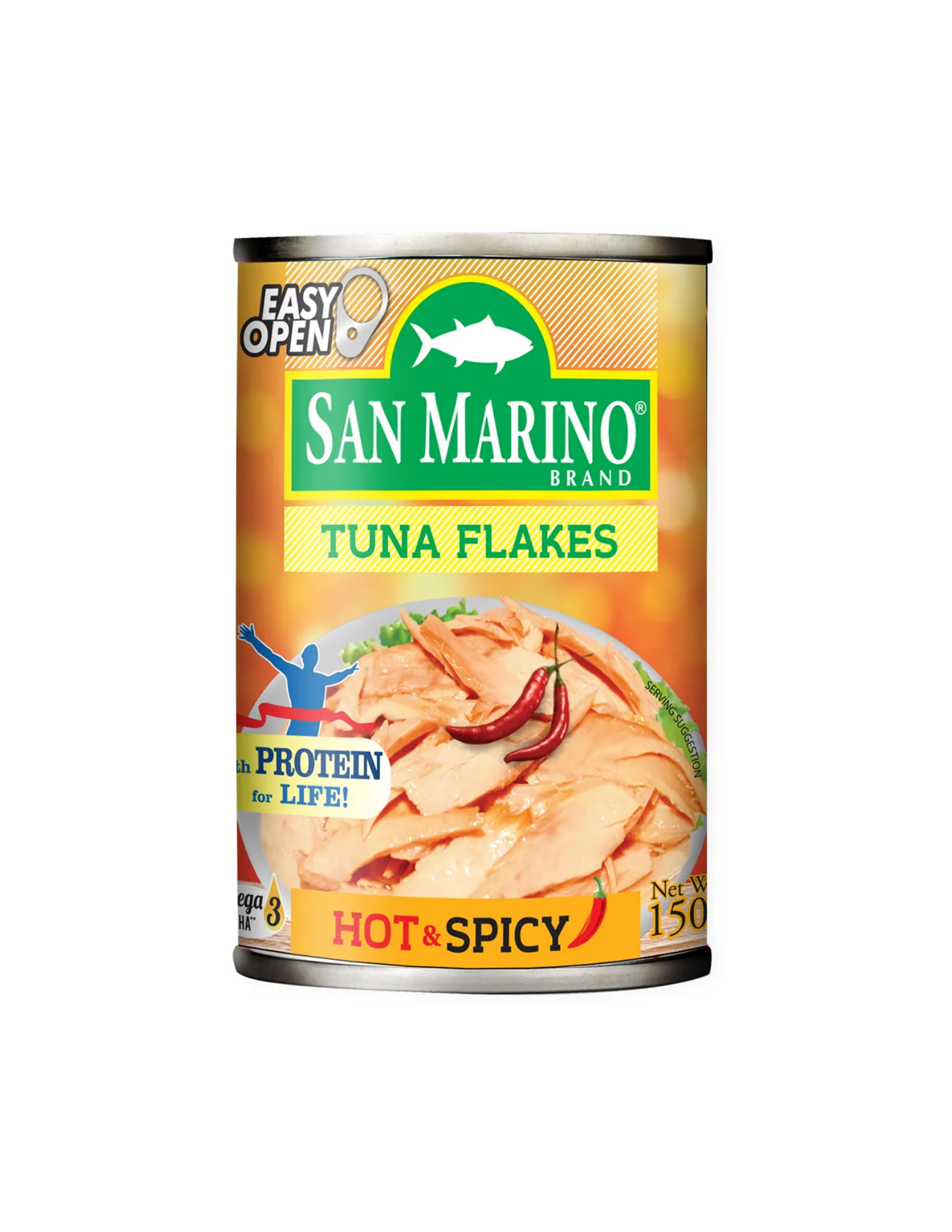 San Marino Tuna Flakes Hot & Spicy, Crafted from premium tuna flakes, this ready-to-eat delight is seasoned with a bold blend of spices and chili, delivering a fiery kick that's perfect for those who crave heat.
