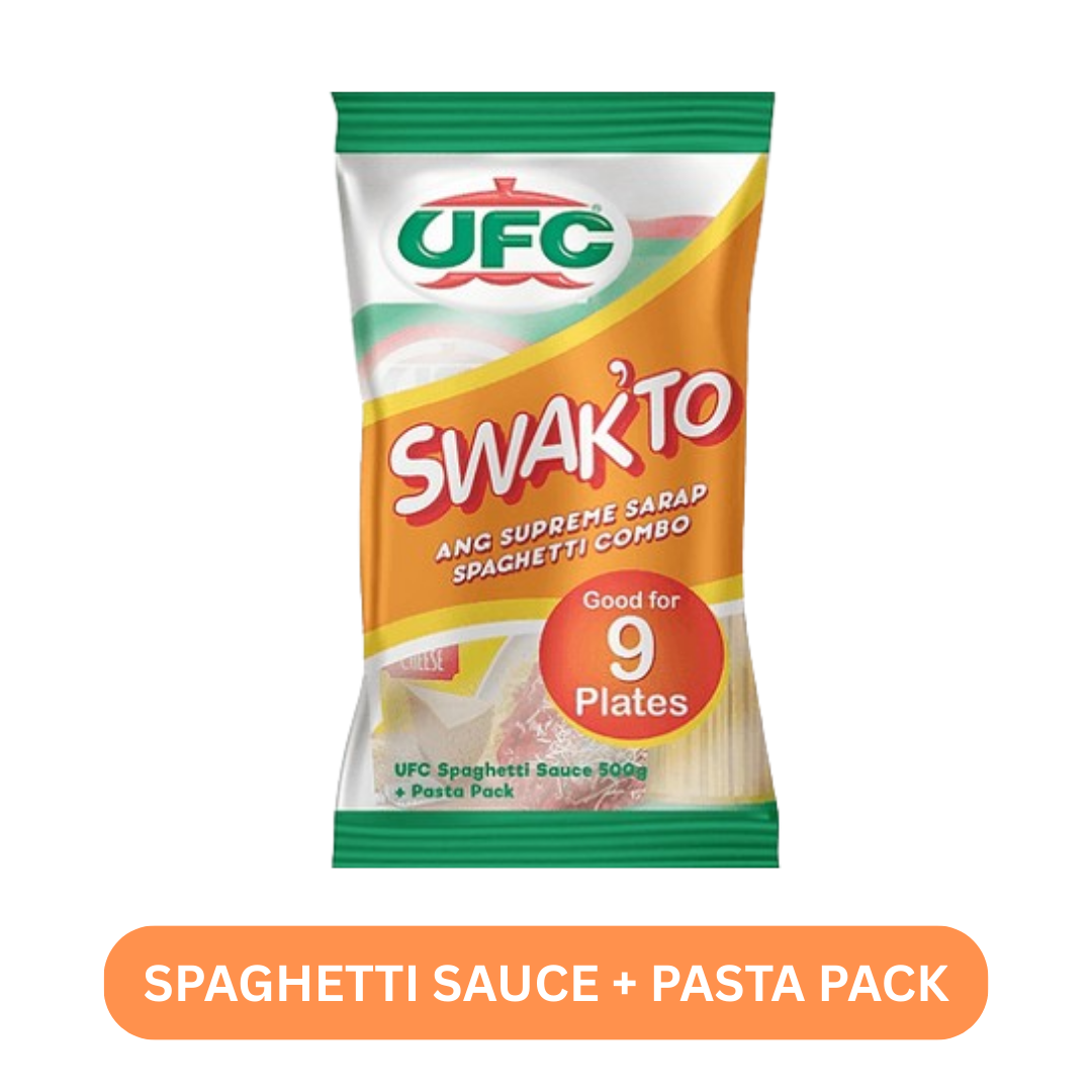 UFC Swakto Pack combines 500g of UFC Spaghetti Sauce Swakto and 350g of spaghetti pasta, offering a convenient solution for preparing flavorful Filipino-style spaghetti meals.